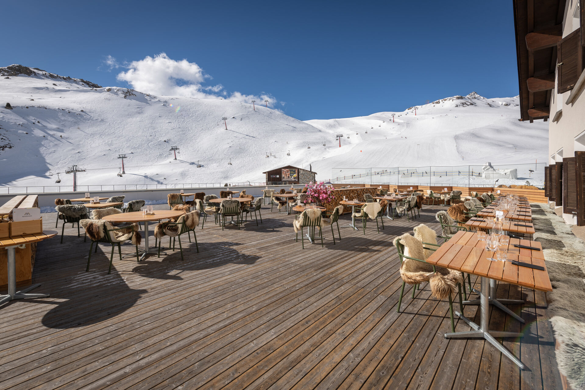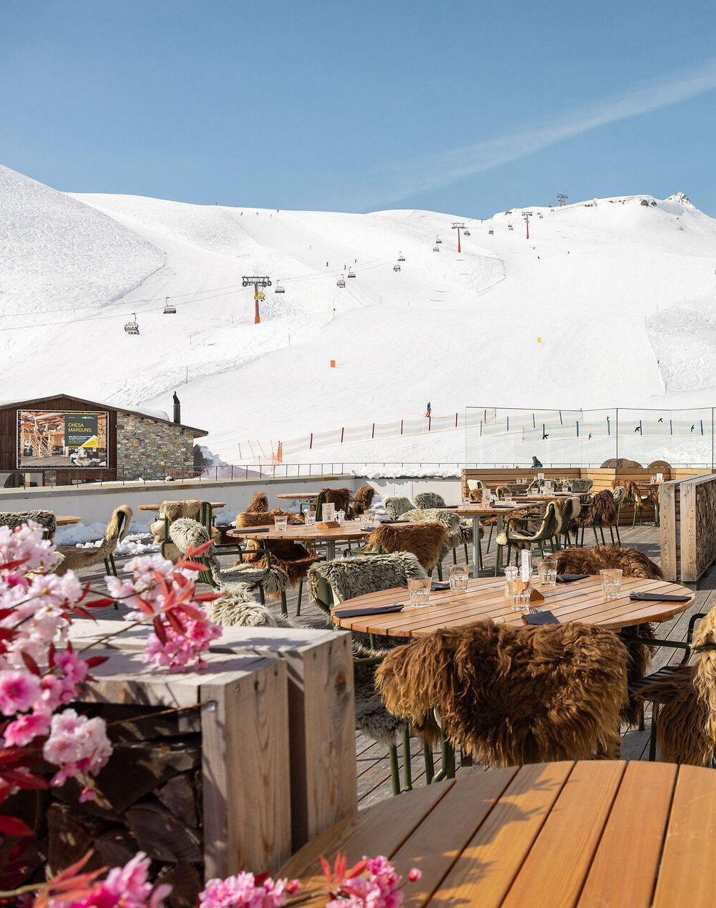 Oben der blaue Himmel, unten der weisse Teppich, und dazwischen ein Traum von einer bedienten Sonnenterrasse. Hier kommen Sonnenanbeterinnen und Sonnenanbeter ganz auf ihre Kosten und erhalten als Beilage zu all den servierten Genüssen eine herrliche Aussicht auf das echte Engadiner Winterpanorama. Das Paradies ist auf Marguns eben nur ein paar wenige Treppenstufen entfernt.