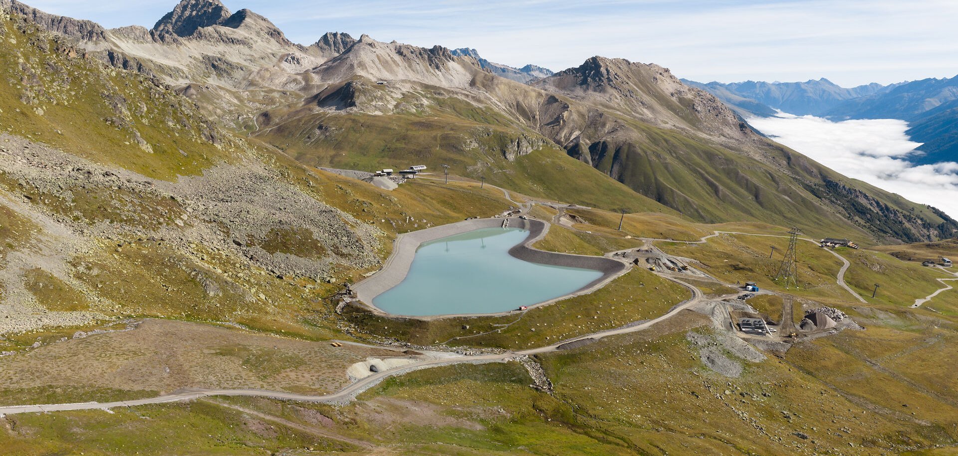 Diesen Sommer werden die Dammarbeiten abgeschlossen und der Innenbereich des zukünftigen Naturspeichersees mit einer Schicht Kies „ausgekleidet“. Darauf kommt eine Schicht mit spezieller Folie, um das Versickern des Schmelzwassers zu verhindern. Abschliessend wird eine weitere Kiesschicht auf der Folie verteilt, um so einen natürlichen Grund des Sees zu schaffen. Im Anschluss wird der Lej Nair Pitschen befüllt, so dass wir im Herbst mit der Beschneiung starten können.