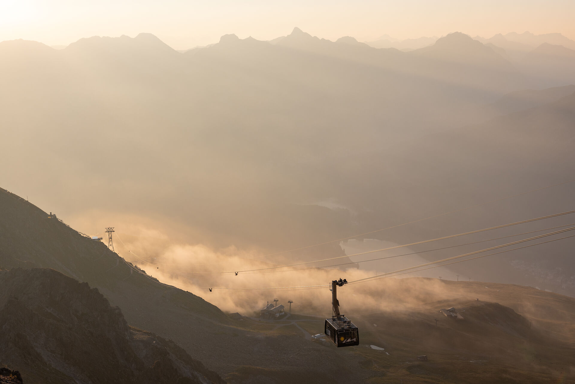 Der Treffpunkt für alle Teilnehmer des Piz Nair Sunrise ist bei der Talstation der Standseilbahn in St. Moritz Dorf. Noch vor den offiziellen Betriebszeiten und noch vor dem Morgengrauen geht es anschliessend zusammen per Bahn auf den Gipfel des Piz Nair. Bereits bei der Ankunft erwartet die Gäste ein reichhaltiges Frühstücksbuffet. Dieses steht den Teilnehmern während des Sonnenaufgangs und auch danach bis zum offiziellen Event-Ende um 9.00 Uhr zum Genuss zur Verfügung. Natürlich dürfen Sie auch vor dem offiziellen Event-Ende die Trails und Wanderwege ab dem Piz Nair unter die Füsse oder die Räder nehmen. Bitte beachten Sie jedoch, dass es keine Extra-Bergfahrt zurück auf den Piz Nair vor dem offiziellen Betriebsbeginn (08.45 Uhr) geben wird. Die erste offizielle Talfahrt der Pendelbahn Piz Nair ist um 09.05 Uhr. Für alle, die nicht bis zum offiziellen Event-Ende um 9.00 Uhr warten möchten, steht bereits um 8.10 Uhr eine Extrafahrt mit der Pendelbahn vom Piz Nair nach Corviglia zur Verfügung.