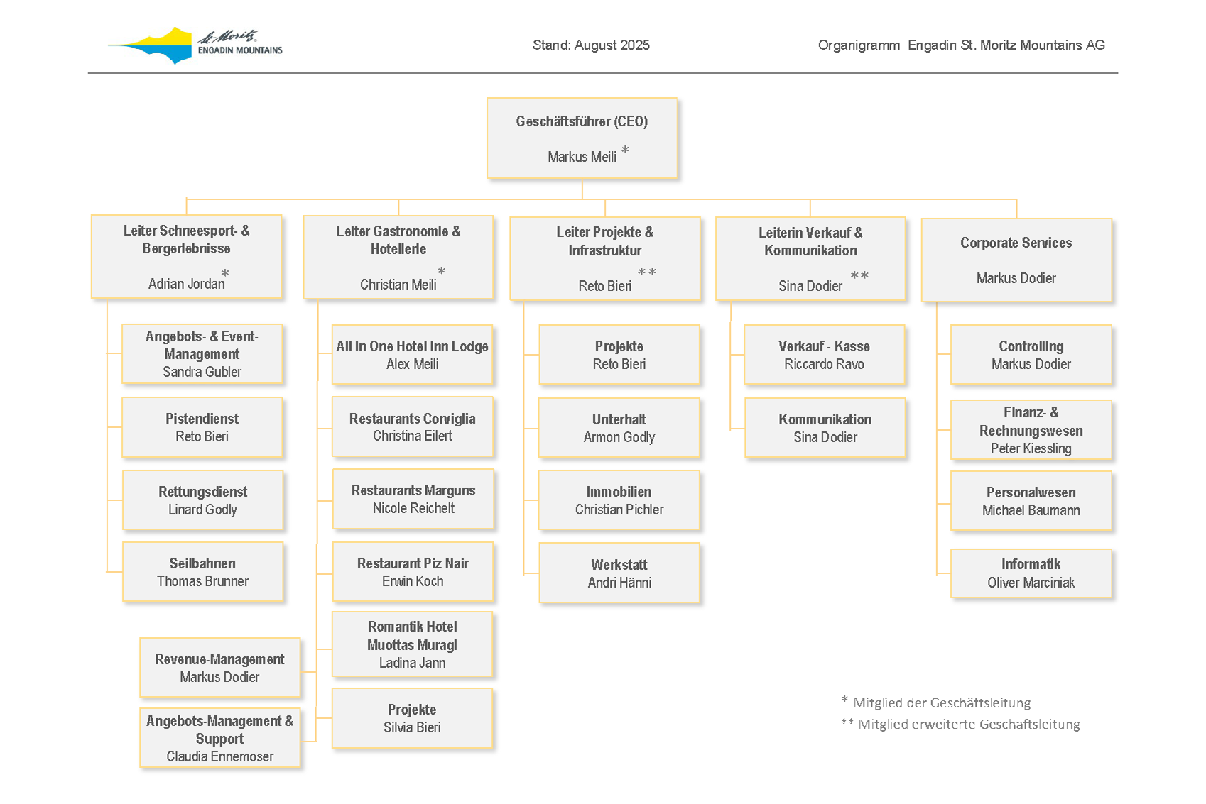 Die Ausführung der Geschäfte obliegt der Geschäftsleitung der Engadin St. Moritz Mountains AG. Unterstützt wird dieses Organ im Wesentlichen von den Kadermitarbeitenden. Der Verwaltungsrat ist als oberstes Aufsichts- und Gestaltungsorgan unserer Organisation tätig.