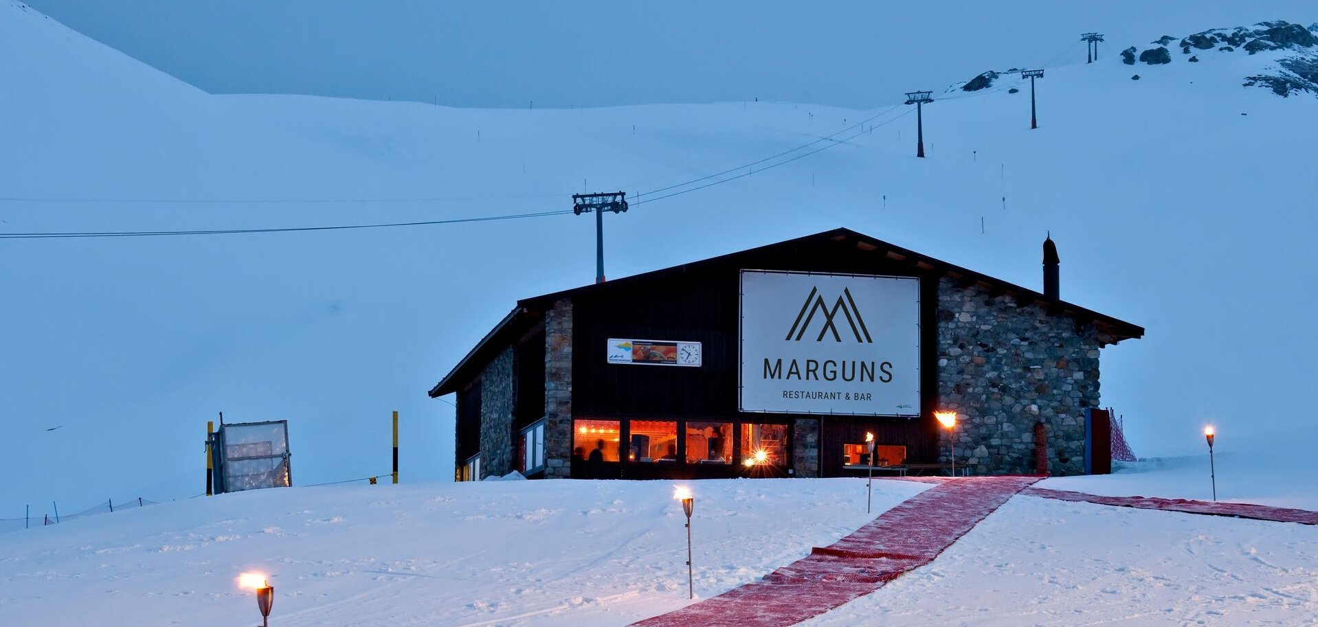 You can reach the Chesa by taking the Celerina-Marguns gondola lift, which is at your exclusive disposal in the evening. From the top station, the Chesa can be reached in a few minutes on foot. A red carpet, illuminated with torches, welcomes you on request in winter and guides you to your unforgettable location.