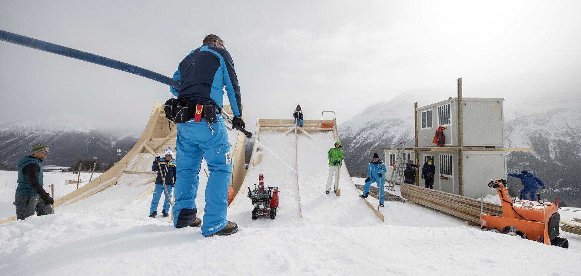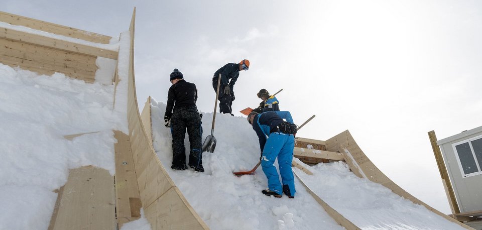 We start the preparatory work for all disciplines in January and February: We produce the snow and design the jumps and landings, for example. For the aerials, we then build the wooden structure, which is filled with snow. Such preparatory work is necessary for every discipline. Once everything is optimally prepared, it is important to keep a close eye on the weather forecast. If there is snowfall during the events or the temperatures rise, things can of course get a little hectic. For example, in heavy snowfall, we may have to clear snow throughout the night to make sure everything is ready in time for the start of the race. Fortunately, we have a great, dedicated team and excellent cooperation - be it with the organizing committee, the volunteers or those responsible for the various disciplines. Together, we do everything we can to ensure that everything runs smoothly on day X.